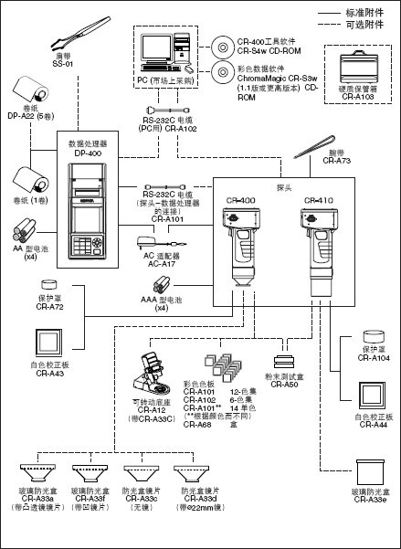 另售配件 | 硬盒CR-A103、RS-232C线缆CR-A102(连接PC)、粉体单元CR-A50、CR-400实用软件CR-S4w、色彩管理软件SpectraMagic NX CM-S100w、带玻璃罩的遮光筒CR-A33a/f、CR-A33c/d遮光筒、测量头托架CR-A12、彩色瓦片 | 硬盒CR-A103、RS-232C线缆CR-A102(连接PC)、粉体单元CR-A50、CR-400实用软件CR-S4w、色彩管理软件SpectraMagic NX CM-S100w、带玻璃罩的遮光筒CR-A33e |